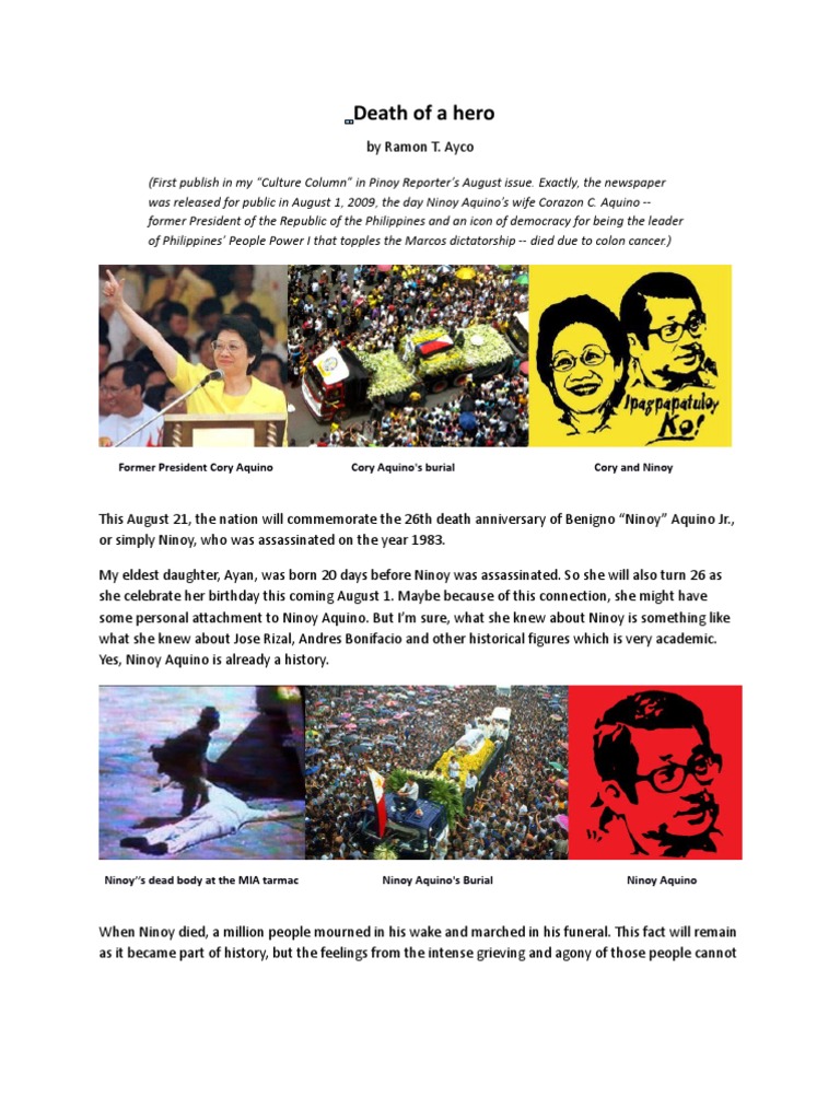 I do not believe i'm sinning against my creator because in the end, i am not really my own executioner. Senator aquino, along with his wife corazon, are attributed as leading lights in. The holiday also served as a means to boost tourism in the philippines. Aquino led the filipino opposition party during the reign of aquino's death transformed the philippine opposition from a small isolated movement to a massive. A time comes in a man's life when he must prefer a meaningful death to a meaningless life.